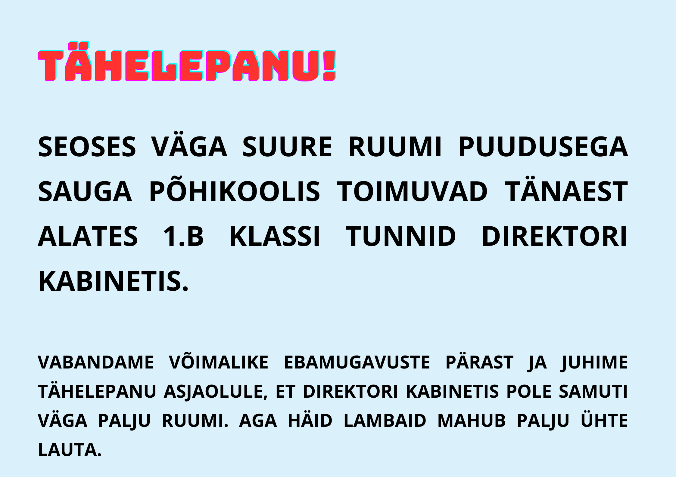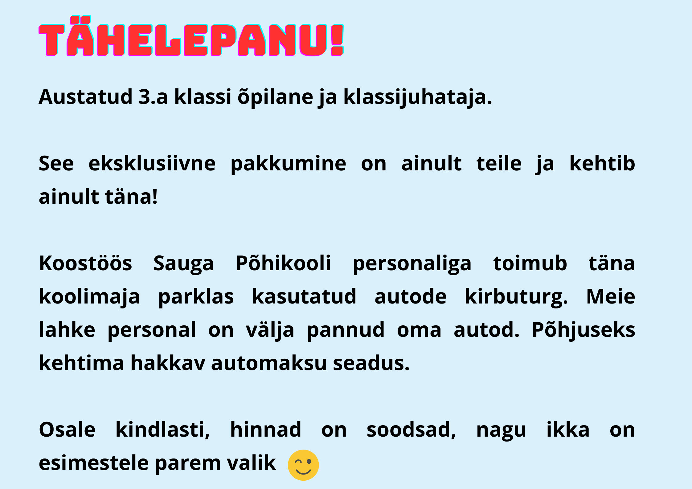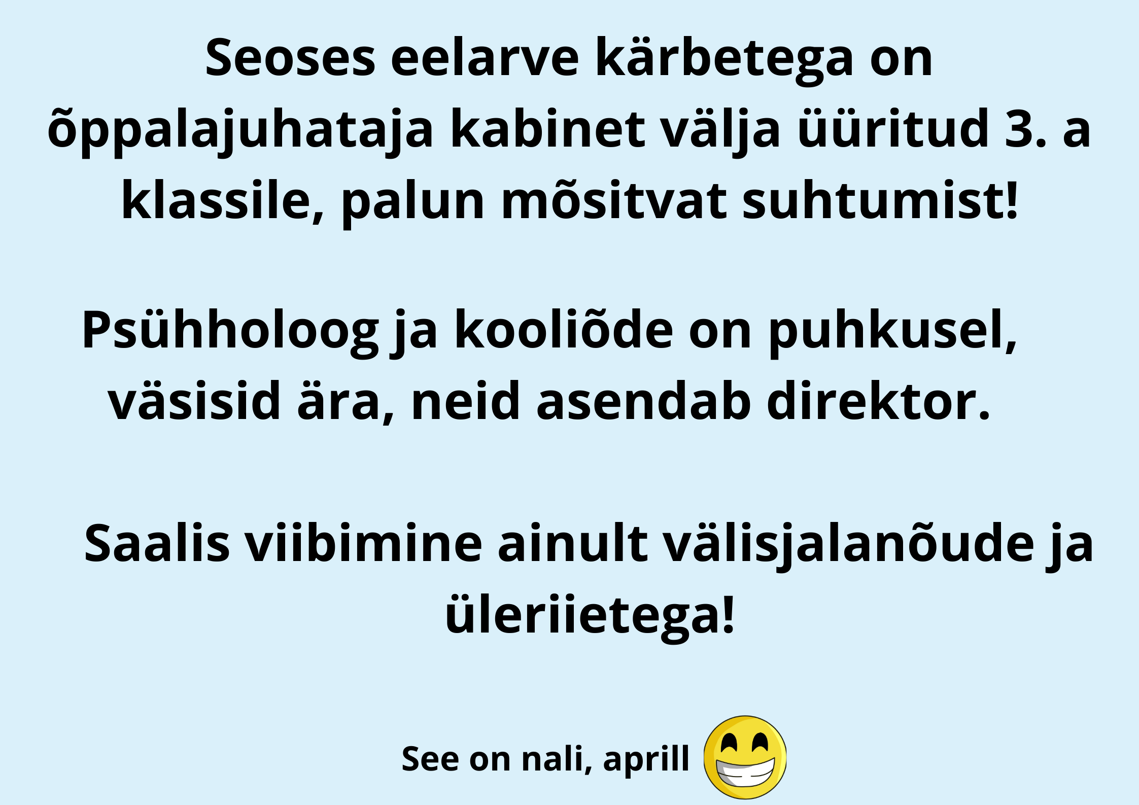 1.aprill on naljapäev ja ka Sauga kool tähistas seda aprillipäeva lõbusalt. Koolikotti ega käekotti polnud täna vaja kaasa võtta, võis tulla millega iganes. Niisiis polnud imestada, kui koolimaja peal ühtäkki ostukäru vastu sõitis või õpilane prügikast kaenlas trepist ülesse vantsis ja isa tööriista kohver oli ka hea lahendus. Lisaks ilutsesid koolimaja seintel lõbusad Juku anekdoodid ja segadust tekitavad teated. Päeva pärl oli aga EuroSaugaSPTeenuste parkimiskorralduse teade, mis nii mõnegi õpetaja algul kukalt kratsima pani ;)